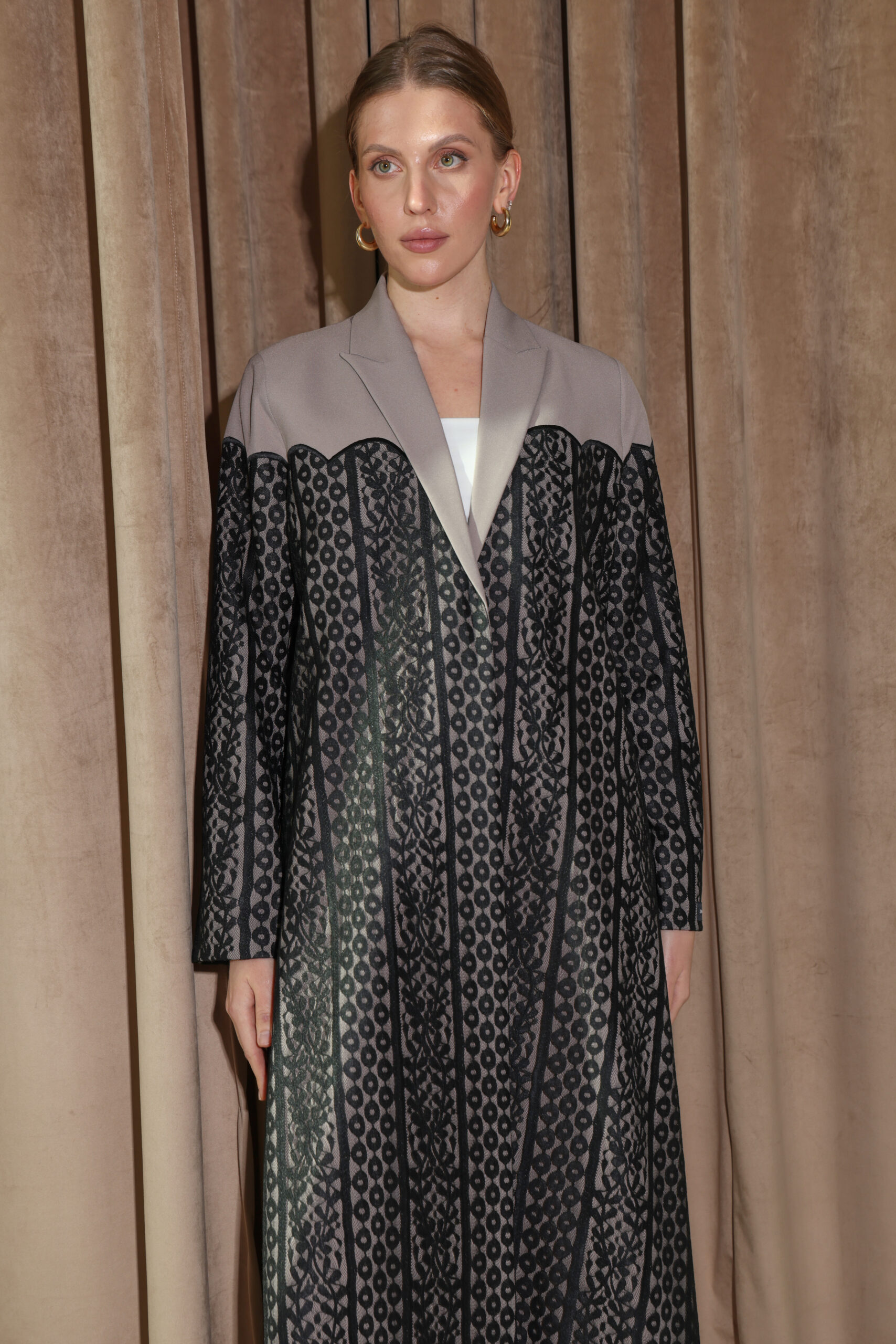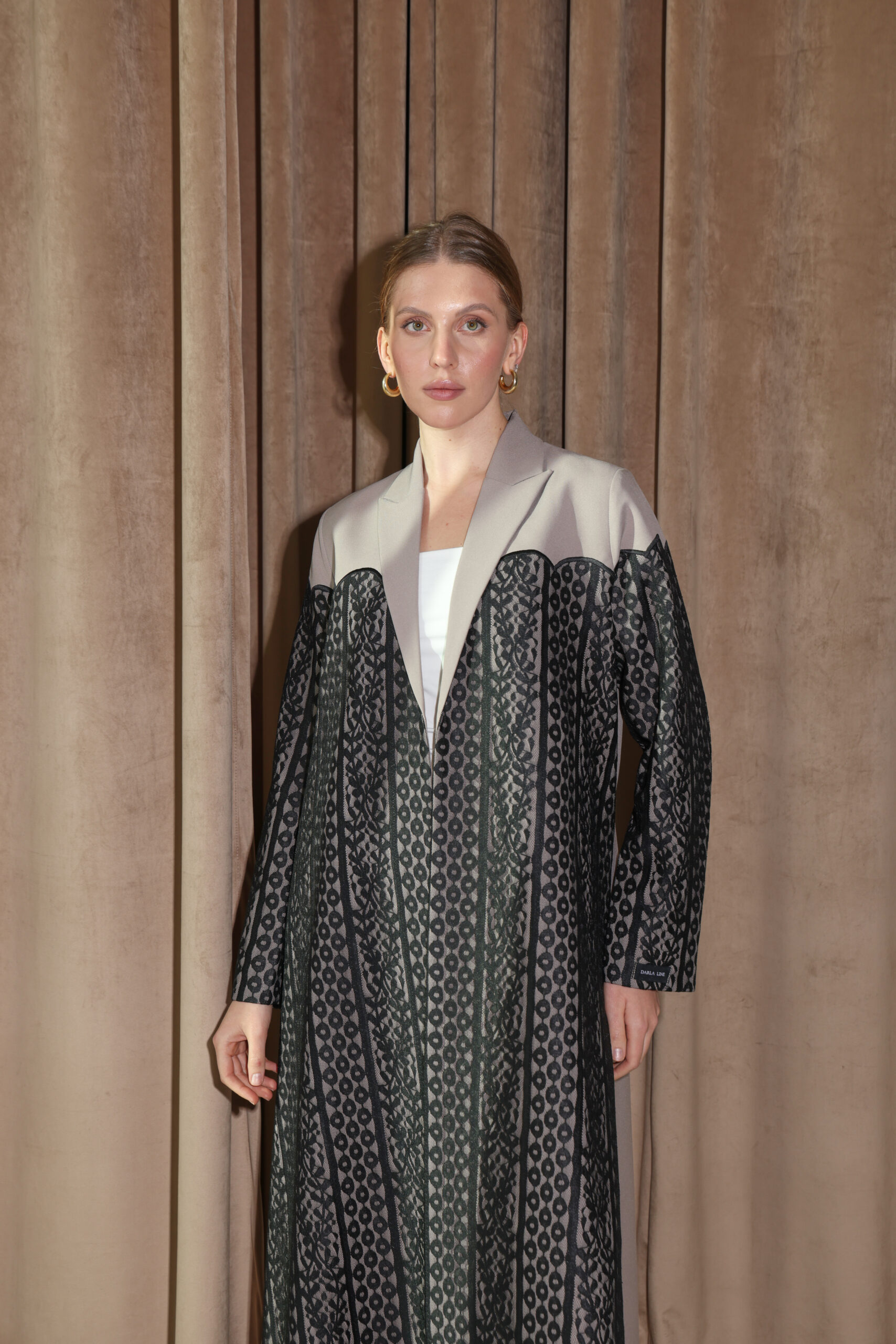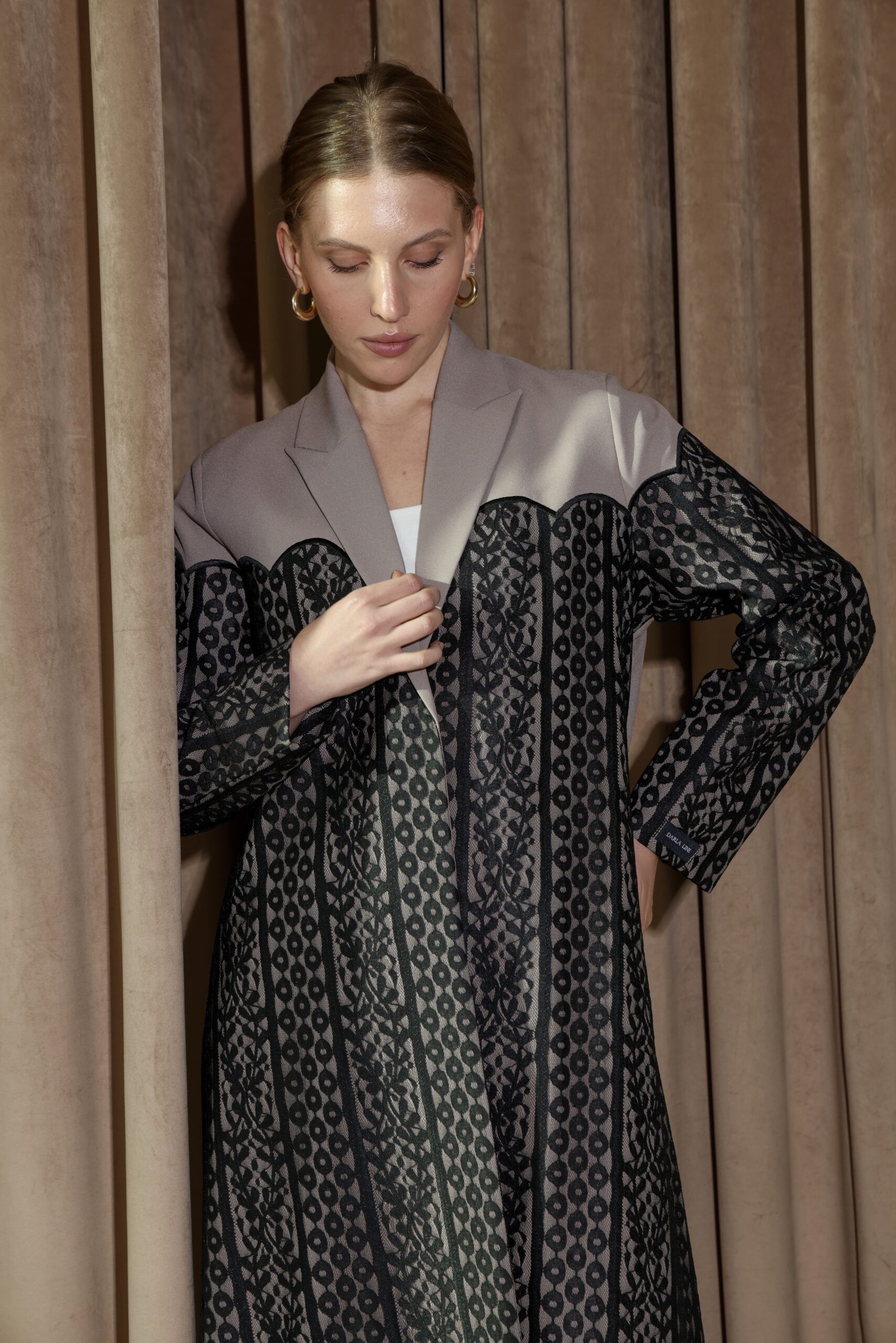 عباية من قماش الكريب الكوري والدانتيل الأسود بتفاصيل هندسية طولية تمنح الإطلالة حضورًا أنيقًا وملمسًا فاخرًا